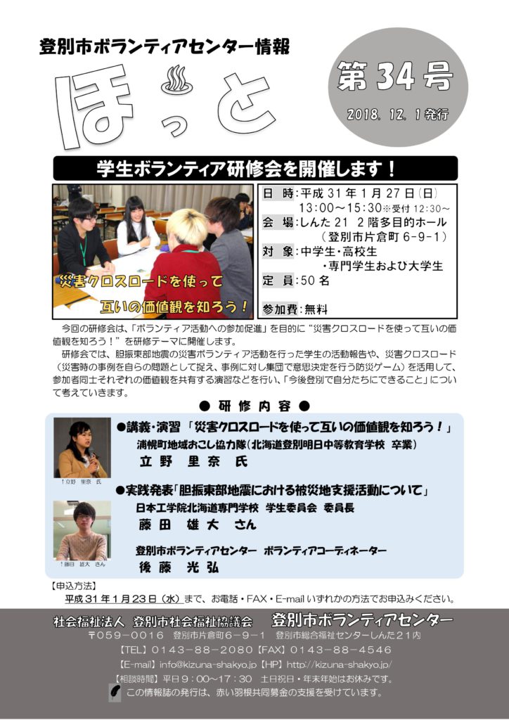 登別市ボランティアセンター情報誌ほっと♨第34号(12月1日発行)を掲載しましたので、下記PDFよりご覧ください。 バックナンバーはこちらから -