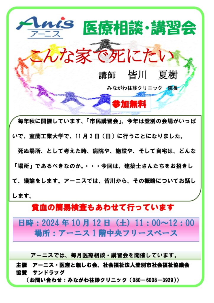 本会とアーニス・医療と親しむ会(問合せ先:みながわ往診クリニック)では、毎月医療相談・講習会を開催しており、次回はチラシのとおり開催します。 参加費無料、申し込み不要ですので、ぜひご参加ください。 -