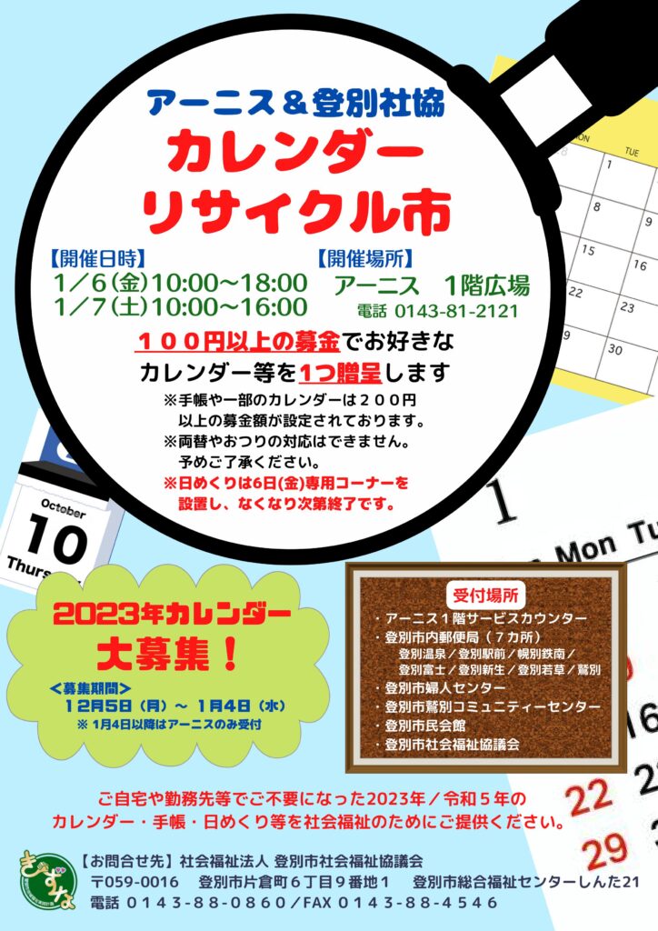 中央町のショッピングセンターアーニスと協働で毎年実施している「カレンダーリサイクル市」を2023年1月6日・7日で開催します。100円以上の募金でお好きなカレンダー等を1つ贈呈しますので、ぜひお立ち寄りください。 また、活用させていただく2023年のカ... -
